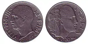 Третий монетный тип получил название «Impero» (рус. Империя). Монета была выпущена в честь провозглашения империи (в 1935 году Муссолини завоевал Эфиопию, после чего объявил о «втором рождении Римской империи», — король Италии получил титул императора Эфиопии). Её особенностью стало наличие двух дат выпуска на реверсе: года по общепринятому григорианскому календарю и года прихода Муссолини к власти римскими цифрами. В первые годы (1936—1938) их чеканили из никеля, в последующие — из акмонитала (нержавеющей хромистой стали). В зависимости от лигатуры одна часть монет из акмонитала этого типа магнитится, другая — нет. Также одни экземпляры этой серии имеют гладкий гурт, другие — рифлёный. В связи с этими особенностями, несмотря на схожесть изображения, размера и веса, в нумизматической литературе выделяют 5 разновидностей монет данного типа[7][8]: