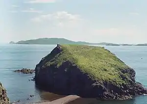 ![]() Восточный берег острова с кекуром и центральной наиболее высокой скалой. | |