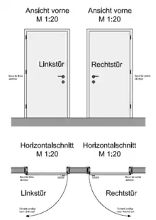Разъёмные петли делятся на левые и правые, от этого зависит, в какую сторону будет открываться дверь. Согласно ГОСТ 5088-2005, «правые» петли соответствуют двери, створка которой закрывается «против часовой стрелки». Рисунок содержится в ГОСТ 6629-88[1].