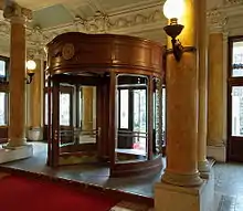 - Вращающаяся дверь имеет несколько крыльев (как правило, четыре) прикреплённых к центральному валу, образуя отсеки, которые вращаются вокруг вертикальной оси. Вращающаяся дверь позволяет людям проходить в обоих направлениях, не сталкиваясь, и образует воздушный шлюз, обеспечивающий герметичность между внутренней и внешней частью.