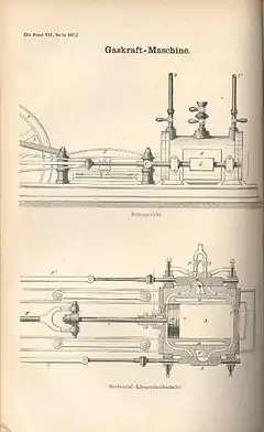На конструкцию одноцилиндрового двухтактного газового двигателя заметное влияние оказали технические решения, ранее использованные в паровой машине Уатта: поршень двойного действия (рабочими ходами являются и прямой и обратный), золотниковый механизм, управляющий подачей рабочего тела в цилиндр и удалением отработанного. Только рабочим телом является не пар, а продукты сгорания смеси воздуха и светильного газа, вырабатываемого газогенератором.