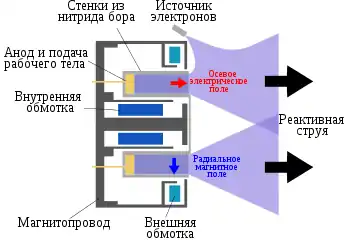 Холловский двигатель состоит из кольцевой камеры между анодом и катодом, вокруг которой расположены магниты. С одной стороны в камеру подаётся рабочее тело, с другой стороны происходит истекание плазмы. Нейтрализация положительного заряда плазмы производится электронами, эмитируемыми с катода.