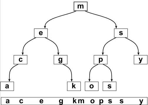 ![]() Рис. 1. Двоичное дерево поиска, в котором ключами являются латинские символы упорядоченные по алфавиту. |