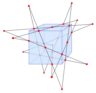 Другое построение, показанное на иллюстрации, получается путём расположения двенадцати прямых, проходящих через центры шести сторон куба и лежащих на плоскости этих сторон, и каждая прямая имеет один и тот же угол с соответствующими рёбрами куба.