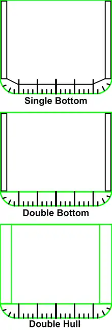 Ещё более надёжную защиту обеспечивают двойные борта, образованные продольными переборками, отстоящими от бортовой обшивки на расстоянии 800—1500 мм. Двойной борт, так же как и двойное дно, увеличивает живучесть судна при случайном проломе обшивки. Существует два типа конструкций двойных бортов: с наклонными (для сыпучих грузов) или вертикальными стенками.