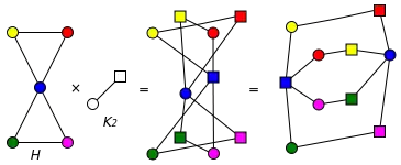 Двудольное двойное покрытие графа G имеет две вершины ui и wi для каждой вершины vi графа G. Две вершины ui и wj связаны ребром в двойном покрытии тогда и только тогда, когда vi и vj связаны ребром в G. Например, ниже приведен рисунок двудольного двойного покрытия недвудольного графа H. На иллюстрации каждая вершина в тензорном произведении показана цветом из первого множителя (H), а форма вершины взята из второго множителя (K2). Таким образом, вершины ui в двойном покрытии показаны кружками, а вершины wi показаны квадратиками.