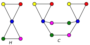 - Граф C является накрывающим графом графа H — существует сюръективный локальный изоморфизм f из C в H, показанный на рисунке цветами. Например, f отображает обе синие вершины из C в синюю вершину в H. Более того, пусть X является окрестностью синей вершины в C и пусть Y является окрестностью синей вершины в H. Тогда ограничение f на X является биекцией из X в Y. В частности, степени каждой из голубых вершин равны. То же самое применимо к любому цвету.