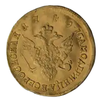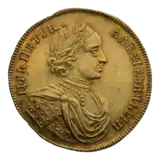 Червонцы в Российской империи чеканились при Петре I с 1701 года. Двойной червонец образца 1701 года чеканился на Кадашёвском монетном дворе из золота 969-й пробы тем же штемпелем, что и червонец, но имел вдвое большую толщину. Диаметр двойного червонца 1701 года составлял 24 мм, вес — 6,94 г. В оформлении двойной червонец не отличался от червонца того же года. На аверсе изображён профиль Петра I в лавровом венке и надпись «ЦАРЬ ПЕТР АЛЕКСЕЕВИЧ». На реверсе двуглавый орёл, выполненная кириллицей дата чеканки и надпись «САМОДЕРЖЕЦ ВСЕЯ РОССИИ». По краю монеты с обеих сторон — выпуклый точечный ободок[3].