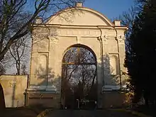 Ограда вокруг парка и двора дворца из кирпича и покрыта штукатуркой. Ограда и ворота сооружены в конце XVII или в начале XVIII века. Все ворота в стиле барокко с более поздними чертами классицизма. Наиболее пышно декорированные ворота выходят на улицу Антакальнё. На высоких массивных опорах с цоколем возвышается антаблемент и полукруглая арка. Между пилястрами располагаются ниши, в которых в прошлом стояли скульптуры (в других воротах — декоративные вазы). Большая часть плоскости ворот отделана рустом. По фризу размещены триглифы.[13]