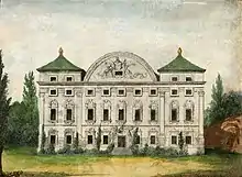 Барочный дворец в 1691 году был возведён на месте деревянного дворца Льва Сапеги (который здесь и умер в 1633 году во время пира в честь венецианского посланника)[5]. Автор проекта признается неизвестным[5], по другим сведениям им считается Джованни Баттиста Фредиани[1][6] или скульптор и архитектор Пьетро Перти, ранее декорировавший костёл Святых апостолов Петра и Павла и строивший дворец Слушков[7]. В декорировании дворца участвовал Пьетро Перти (рельефы из стукко) и Джованни Мариа Галли (несохранившиеся скульптуры). Предполагается, что фрески выполнил художник Микеланджело Паллони[5]; по другим сведениям, фрески принадлежат итальянцу Дельбено[8][9].