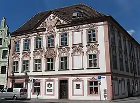 Дворец был построен в 1745 году в стиле рококо. Украшение фасада было спроектировано Иоганном Баптистом Циммерманом. С восточной стороны фронтона изображён герб строителя Фрайхерра Франца фон Эцдорфа и его жены Марии Терезии. На нижнем этаже между семью окнами расположен картуш с изображением Непорочной Девы Марии. Рядом с воротами со стороны юго-запада расположены две колоны, представленные в композиции тосканского ордера[1].