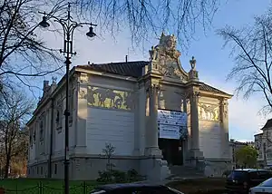 Здание в стиле модерн было построено в 1901 году по проекту польского архитектора Францишека Мончиского, который использовал в качестве образца выставочный павильон сецессиона в Вене. В отделке здания приняли участие известные краковские художники и скульпторы. Фриз разработал Яцек Мальчевский. Антоний Мадейский, Константы Лящка и Теодор Ригер выполнили бюсты известных польских культурных деятелей. Фасад здания украшен портиком в виде колонны, которую венчает статуя Аполлона с золотым нимбом. Стены здания украшены пилястрами, которые укреплены арками окон и над всем возвышается вход с двумя колоннами.