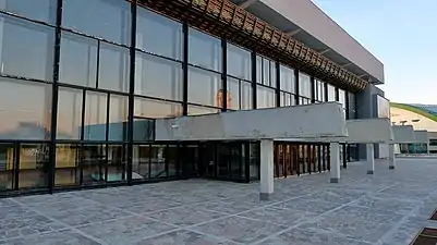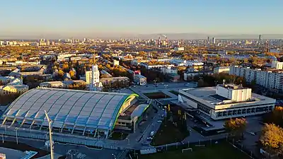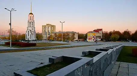 Перед дворцом разбита просторная площадь с наклонным пандусом, ведущим к главному входу в здание[8]. На площади перед зданием установлен памятник Н. И. Кузнецову. Также в непосредственной близости находится Храм Святых Сергия Радонежского и Елизаветы и манеж «Урал».