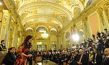 В гостиной проходят торжественные приёмы. Именно здесь, министры принимают присягу и послы вручают президенту верительные грамоты.