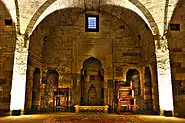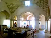 Небольшой проём, расположенный на северной стороне дворцового сада, ведёт в замкнутый дворик Диван-хане, который с трёх сторон обрамлён стрельчатой аркадой. В композиционном центре Диван-хане на высоком стилобате стоит восьмигранная ротонда-павильон. Зал этой ротонды окружён открытой аркадой того же ордера. Эллиптическое покрытие со слегка заострённой макушкой защищено снаружи гранёным каменным куполом. Западный фасад ротонды выделен украшенным арабесками[31] порталом, каннелированный полукупол стрельчатой конхи которого опирается на систему тонко промоделированных сталактитов (мукарнасы). Тимпаны и надпроёмные плоскости покрыты орнаментом. Портал ведёт в сени, соединяющие зал с размещённым в стилобате склепом и служебными комнатами, расположенными одна над другой[32].