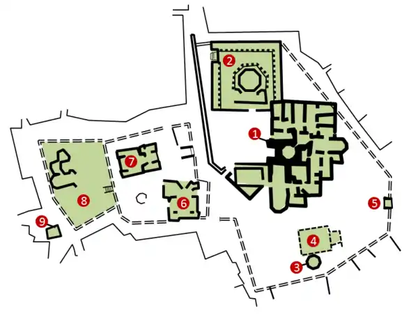 | Дворец и «диван-хане» • мавзолей «дервиша» и Восточный портал • дворцовая мечеть и усыпальница • баня и овдан | |