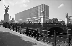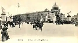 | Дворцовый мост на проекте Шинкеля, 1819 | Вид с Дворцового моста на Городской дворец, 1900 | Мост Маркса и Энгельса и снесённое в 1996 году здание министерства иностранных дел ГДР |
