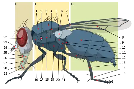 Переднегрудь и заднегрудь сильно редуцированы. Среднегрудь наибольшая по объёму, содержит крыловую мускулатуру и несёт пару крыльев. Плеврон плевральным вентрально идущим швом разделяется на передний склерит — эпистерн и задний — эпимер, каждый из этих склеритов горизонтальным швом делится на верхнюю и нижнюю пластинки: эпистерн делится на анэпистерн и катэпистерн, а эпимер делится на анэпимер и катэпимер. Для обозначения принадлежности каждого склерита к определённому сегменту используются приставки пре-, мезо- и мета-, причём для среднегруди приставка мезо- обычно не применяется[8].
