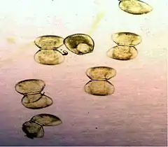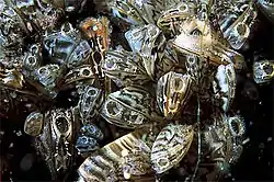 У некоторых пресноводных моллюсков (перловиц, беззубок) имеется особая личинка — глохидий, имеющая тонкостенную двустворчатую раковину с округлыми створками и крючками на брюшном крае. Большинство органов глохидия ещё недоразвито: отсутствуют жабры, нога рудиментарна[59]. У таких моллюсков оплодотворение происходит в мантийной полости самки, и глохидии развиваются в её жабрах. Глохидий способен плавать, хлопая створками. С помощью биссусовой нити глохидий прикрепляется к жабрам проплывающих мимо рыб и с помощью зубцов внедряется в их ткани, где и происходит его дальнейшее развитие. Позднее маленький моллюск, развившийся из глохидия, выпадает на дно через разрыв опухолевых бугорков на коже рыб. Таким образом, глохидий является эктопаразитом, а рыбы обеспечивают его распространение[60]. Тем не менее, серьёзного ущерба рыбе глохидии не приносят[65].