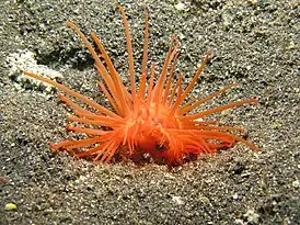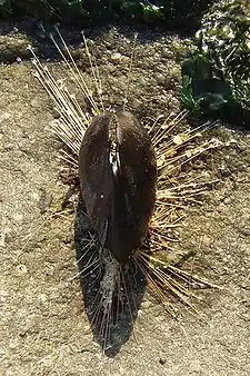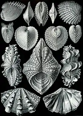 Плеченогие (Brachiopoda) — морские организмы, напоминающие двустворчатых моллюсков раковиной из двух створок и близким размером. Однако они не имеют близкого родства с моллюсками, и их выделяют в отдельный тип. Сходство их внешнего строения является конвергентным, то есть обусловлено схожим образом жизни. В настоящее время брахиоподы менее распространены, чем двустворчатые[63].