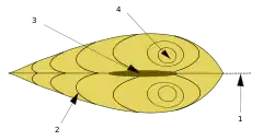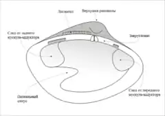 На одном из краев створки раковины ближе к лигаменту заметен округлый шершавый выступ — макушка створки раковины (см. рисунок). Это самая старая часть раковины, так как раковина прирастает по краю с противоположной стороны. Край створки, несущий макушку, называется спинным, или верхним, или замочным, краем, противоположный ему край — брюшным, или нижним, краем[26]. Различают также передний и задний края створки. На заднем крае располагается мантийный синус (см. раздел Мантия и мантийная полость), отпечаток заднего мускула-замыкателя больше (см. раздел Мускулатура)[26]. У некоторых двустворчатых концы верхнего края, оттянутые от макушки вперёд и назад, образуют ушки[26]. Если расположить раковину верхушкой раковины вверх и передним концом от себя, то створку, находящуюся слева от плоскости смыкания створок, называют левой, а створку, находящуюся справа, — правой[26][27]. У живого моллюска между брюшными краями створок раковины располагаются нога и биссусовая железа (если есть), а на заднем конце открываются отверстия сифонов.