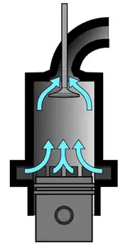 В то время как в четырёхтактном двигателе всасывание свежего заряда происходит за счёт движения поршня из верхней мёртвой точки вниз при открытом впускном клапане, а опорожнение — вверх при открытом выпускном, в двухтактном свежий заряд должен поступать в цилиндр под давлением, вытесняя отработавшие газы. Для создания давления требуется нагнетатель. В упрощённых двигателях для этой цели используется нижняя часть поршня и полость картера — такая схема называется кривошипно-камерной продувкой.