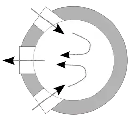 Наиболее распространена петлевая схема продувки, при которой впускные окна расположены достаточно близко к выпускным, однако за счёт формы впускного трубопровода свежий заряд направляется вверх и в меньшей степени увлекается отработавшими газами.