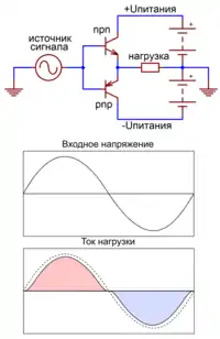 Простейший линейный двухтактный каскад — комплементарный эмиттерный повторитель в режиме B — образуется встречным включением двух эмиттерных повторителей на транзисторах npn- (верхнее плечо) и pnp-структуры (нижнее плечо)[2]. При нулевом управляющем напряжении оба транзистора закрыты, ток нагрузки равен нулю[3]. При превышении порога включения транзистора, примерно +0.5 В, верхний по схеме (npn) транзистор плавно открывается, соединяя положительную шину питания с нагрузкой. При дальнейшем росте управляющего напряжения выходное напряжение повторяет входное со сдвигом на 0.5…0.8 В, нижний транзистор остаётся закрытым. Аналогично, при отрицательных управляющих напряжениях открывается нижний (pnp) транзистор, соединяя нагрузку с отрицательной шиной питания, а верхний остаётся закрытым[3]. В области малых управляющих напряжений, когда оба транзистора закрыты, наблюдаются характерные коммутационные искажения формы сигнала в виде ступеньки[4].