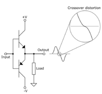 Двухтактные схемы, работающие в режимах B и AB[комм. 2], генерируют специфические нелинейные коммутационные (или комбинационные[4]) искажения при переходе сигнала через ноль[4]. В области малых выходных напряжений, когда один транзистор отключается от нагрузки, а другой поключается к ней, линейная передаточная характеристика каскада приобретает вид ломаной с двумя изгибами или переломами. В наихудшем случае, когда два транзистора или две лампы[57] работают с нулевыми токами покоя, в окрестности нуля оба транзистора выключаются, коэффициент передачи падает до нуля, а на осциллограмме выходного сигнала наблюдается «ступенька». Отрицательная обратная связь не может эффективно подавить такие искажения, так как в проблемной области усилитель фактически отключается от нагрузки[40].