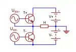 Симметричный двухтактный каскад сходен с дифференциальным каскадом усиления напряжения, также являющимся вариантом параллельной полумостовой схемы[21]. Суммарный ток двух плеч дифференциального каскада ограничен источником стабильного тока в общей цепи эмиттеров, истоков или катодов, — что исключает возможность усиления мощности в экономичном режиме B.