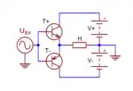Замена одного из активных приборов несимметричной схемы на прибор комплементарного ему типа превращает схему в комплементарную. Если выбранные типы выходных транзисторов («комплементарных ламп» не существует[29]) имеют одинаковые динамические характеристики во всём диапазоне рабочих токов, напряжений и частот, то такая схема воспроизводит положительные и отрицательные входные напряжения симметрично (в реальных усилителях асимметрия неизбежна, в особенности на верхней границе частотного диапазона выходных транзисторов). Входной фазорасщепитель более не нужен: на базы или затворы обоих плеч подаётся одно и то же переменное напряжение сигнала (обычно с некоторым постоянным сдвигом напряжения, устанавливающим режим работы выходных транзисторов)[30][31].
