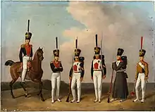 ![]() А. И. Зауэрвейд. «Офицеры, низшие чины и горнист Лейб-гвардии Преображенского полка» (В. И. Дебан-Скоротецкий показан верхом на коне)[2] | ||
