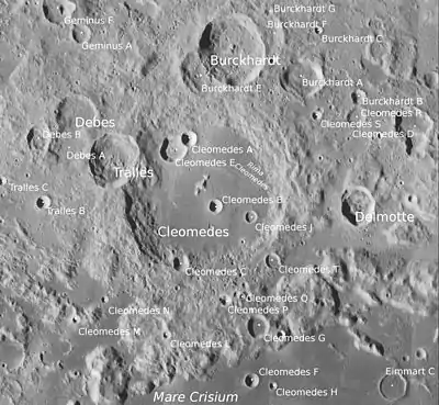 ![]() Снимок зонда Lunar Orbiter – IV. Кратер Дебес в верхней части снимка, правее центра кратер Траллес. | |