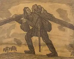 И опять Калевипоэг взваливает на плечи кладь тесовую, на неё мешки, а сверху сажает трёх девушек. И легко несёт он свою поклажу, отмахивая версту за верстой так, что с подошв отлетают искры. А девушки распевают[17]: