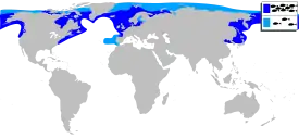Мигрирующий вид. Распространена в Северном Ледовитом и Атлантическом океанах от Канады и Аляски на юг до Нью-Джерси, США, а также в Тихом океане у побережья Аляски, в бассейне Великих озёр. В Евразии живёт у северного побережья Европы от Нидерландов до северной России, включая южную Норвегию и бассейн Балтийского моря. Широко распространена в пресных водах восточной Скандинавии. На восток распространена в Сибири и Японии.