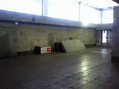 До апреля 2009 года на стенах станции были установлены большие стеклянные витражи. С февраля по апрель 2009 года производились ремонтные работы по замене остекления, после чего витражи были заменены на кирпичную кладку. Окна были оставлены только вдоль крыши, зал стал более тёмным.
