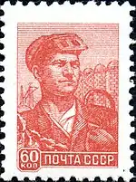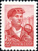 - Сталевар, розово-красная. Офсетная печать, перфорирована: комбинированная гребенчатая зубцовка 12:12½ (на каждые 2 сантиметра края марки приходится 12:12½ зубцов). В марочных листах по 100 (10×10) экземпляров[4][5][7].