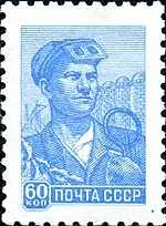 - Сталевар, голубая. Офсетная печать, перфорирована: комбинированная гребенчатая зубцовка 12:12½ (на каждые 2 сантиметра края марки приходится 12:12½ зубцов). В марочных листах по 100 (10×10) экземпляров[4][5][9].