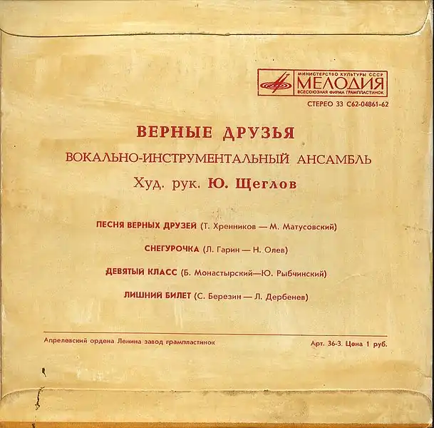 В 1974 году новый аккомпанирующий коллектив Валерия Ободзинского «Верные друзья» в перерыве между гастролями записал на фирме «Мелодия» свой дебютный миньон «Верные друзья», в который вошло четыре песни: «Песня верных друзей» (Тихон Хренников — Михаил Матусовский), «Снегурочка» (Леонид Гарин — Наум Олев), «Девятый класс» (Борис Монастырский — Юрий Рыбчинский) и «Лишний билет» (Сергей Березин — Леонид Дербенёв). При всей случайности своего появления и состава, эта грампластинка стала самой успешной за всю историю ансамбля[2].