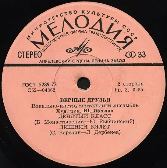 «Яблоко» второй стороны грампластинки «Верные друзья» с записью песни «Девятый класс» (1974)