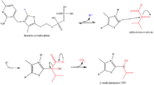 Стадия 1: α-кетоизовалерат объединяется с тиаминпирофосфатом (ТПФ) и затем декарбоксилируется.