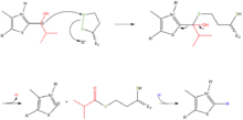 Стадия 2: 2-метилтилпропанол-TПФ окисляется с образованием ацильной группы при одновременном переносе её на липоильный кофактор субъединицы E2. Обратите внимание, что TПФ регенерируется.