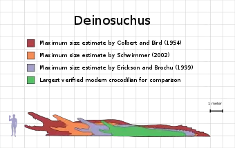 По данным исследования Швиммера, более поздняя разновидность дейнозуха (D. riograndensis) достигала значительно больших размеров и обитала в западной части континента. Это может говорить о том, что те или иные факторы заставили дейнозухов мигрировать и со временем увеличиться в размерах[13][11]. Поскольку известные остатки западных дейнозухов очень фрагментарны, достаточно трудно оценить их размеры. В 1954 году Эдвин Н. Кольбер и Роланд Т. Бёрд реконструировали нижнюю челюсть дейнозуха (образец AMNH 3073) длиной 1,8 м и рассчитали «на основе сравнительных измерений» с современным кубинским крокодилом, что общая длина тела гигантского крокодила (известного на тот момент как Phobosuchus riograndensis) могла достигать 15 м[4]. Однако, в настоящее время данная реконструкция черепа считается недостоверной[11]. Хорошо сохранившийся череп, обнаруженный в Техасе, показывает, что длина головы животного составляла 1,31 м, и исходя из этого Швиммер определил общую его длину в 9,8 м[11]. Значение в 8—10 м — ранее было предположено Грегори М. Эриксоном и Кристофером А. Брошу для того же образца в 1999 году[18][11]. Более крупный экземпляр дейнозуха (TMM 43632-1), длина черепа которого оценивается в 1,475 м, на основе пропорций современного миссисипского аллигатора был оценён Фарлоу и соавторами в 10,64 м[19]. Хотя крупнейшие остатки черепов дейнозухов слишком плохо сохранились, чтобы использовать эти методы оценки, масштабирование от позвонков предполагает, что некоторые из них достигали ещё более крупных размеров. Таким образом Швиммер определил длину AMNH 3073 и CM 963 (голотипа «Deinosuchus hatcheri») в не менее чем 12 м, а возможный вес — до 8,5 т или более. Длина их черепов скорее всего превышала 1,5 м[11]. Причем, известны и более крупные позвонки дейнозухов, размеры которых не уточняются[11]. Предполагается, что крупнейшие представители D. riograndensis, не сохранившиеся в палеонтологической летописи, могли быть ещё больше в линейных размерах. Это весьма вероятно, учитывая очень маленькую выборку окаменелостей западного дейнозуха[13][11]. Также существуют отметины от зубов дейнозуха на панцире морской черепахи, в 4—5 раз превышающие аналогичные отметины от зубов 4-метрового нильского крокодила, которые могут свидетельствовать об огромном размере оставившего их животного (хотя, поскольку находка соответствует ареалу меньшего вида D. rugosus, это довольно таки спорно)[13].