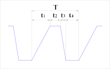 Для тока трапециевидной формы действующее значение можно определить разбив период на отрезки положительного фронта, действия максимального значения и отрицательного фронта: