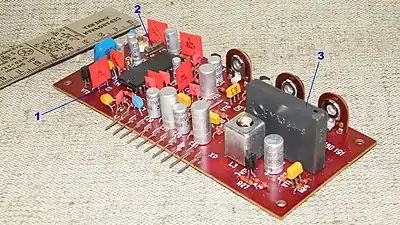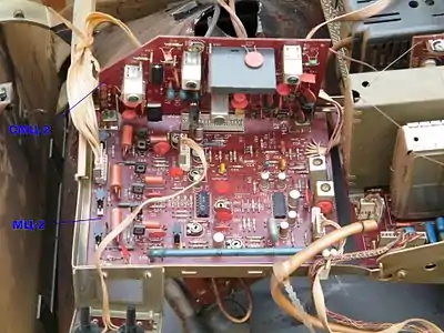 - Декодер-конвертор с использованием принципа транскодирования[24]. Был предложен для приёма телевизорами PAL сигнала в системе SECAM. Содержит стандартный декодер PAL, перед которым включается схема, преобразующая сигнал SECAM в упрощённый сигнал PAL (псевдо-PAL)[25]. В 1981 году фирмой Motorola был разработан набор микросхем «Chroma 3», включавший комбинированный декодер PAL и NTSC и конвертер SECAM/PAL, позволяющий декодировать все 3 системы[26]. Позже похожий набор был создан фирмой Philips. Аналоги микросхем TDA3591 и TDA3562A из этого набора под обозначениями КР1021ХА3 и КР1021ХА4 были освоены советской промышленностью[27] и применялись в ряде телевизоров четвёртого поколения (4УСЦТ с модулем цветности МЦ-41, например «Электрон 51ТЦ-433Д»)[28]. Возможность декодирования системы NTSC в этих телевизорах не использовалась, за исключением экспортных моделей, производившихся для Кубы[29]. Недостатком транскодирования было двойное преобразование сигнала цветности SECAM, приводившее к его повышенным искажениям и появлению муара на изображении[30]