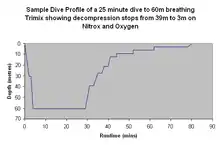 Образец профиля погружения длительностью 25 минут на глубине 60 метров с использованием тримикса. Показаны декомпрессионные остановки с 39 до 3 метров на нитроксе и кислороде.