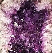 - Окраска — Для многих минералов характерны значительные колебания цвета, интенсивности и равномерности окраски. По интенсивности окраски выделяют индивиды сильно-, средне- и слабоокрашенные. Дефектами является бледная окраска и помутнения. Высоко ценятся минералы с яркой, равномерной и интенсивной окраской. Особый интерес представляют зонально окрашенные — полихромные кристаллы, например, эльбаиты, двухцветные топазы и другие. Различают окрашенные разновидности одного и того же минерала. Например для кварца (бесцветная окраска — горный хрусталь, жёлтая — цитрин, фиолетовая — аметист, смоляно-чёрная — морион), для эльбаита (бесцветная окраска — ахроит, синяя — индиголит, зелёная — верделит, красная — рубеллит) и т. п. Оценивают также степень редкости окраски минералов.