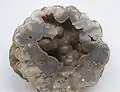 Октябрьское железорудное месторождение — Целестиновые породы, обладающие красивым плойчатым рисунком, образуют желваки размером от 4 до 25 — 30 см, редко до 80 см в диаметре, локализуются среди разрушенных туфов и туфо-брекчий пермь- триасового возраста и приурочены к контакту с магнетитовыми рудами. (Барит-целестиновые породы плохо принимают полировку).
