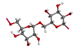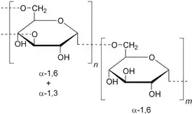 Декстран — полисахарид, разветвлённый полимер глюкозы со средней массой цепей от 3 до 20000 кДа[1]. Главная цепь состоит из молекул, связанных связью α-1,6, а боковые ветви присоединены связями α-1,3. Декстран синтезируется из сахарозы некоторыми уксуснокислыми бактериями. В качестве наиболее известных видов можно привести Leuconostoc mesenteroides и Streptococcus mutans. Крайне обильно декстраны представлены в зубном налёте[2].