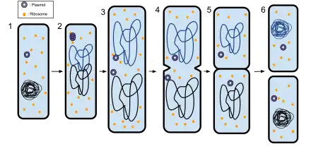 Деление прокариотических клеток — процесс образования дочерних прокариотических клеток из материнской. Ключевыми событиями клеточного цикла как прокариот, так и эукариот являются репликация ДНК и деление клетки. Отличительной чертой деления прокариотических клеток является непосредственное участие реплицированной ДНК в процессе деления[1]. В подавляющем большинстве случаев прокариотические клетки делятся с образованием двух одинаковых по размеру дочерних клеток, поэтому этот процесс ещё иногда называют бинарным делением. Так как чаще всего прокариотические клетки имеют клеточную стенку, бинарное деление сопровождается образованием септы — перегородки между дочерними клетками, которая затем расслаивается посередине. Процесс деления прокариотической клетки подробно изучен на примере Escherichia coli[2].